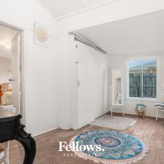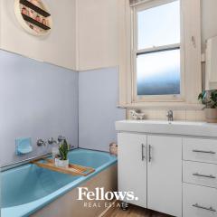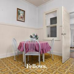 Continue through to the heart of the home you will be greeted by a wonderfully preserved vintage-style kitchen with a welcoming dining nook. This soulful space features a timber island bench, SS sink beneath double windows, SS dishwasher, custom cabinetry, double-door pantry, and the standout original brick fireplace, now beautifully repurposed to frame the stove and oven. Perfect for those who value charm and conversation-worthy design.