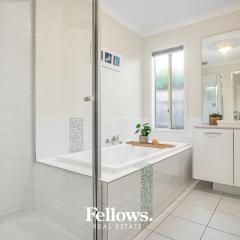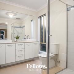 Step inside to discover a thoughtfully designed layout that unfolds with ease. To the right, the king-sized main bedroom creates a peaceful retreat, complete with large windows, a ceiling fan, split-system heating and cooling, and a custom walk-in robe. The ensuite is generously appointed with a dual-sink vanity, oversized mirror, and spacious glass shower, delivering everyday luxury.