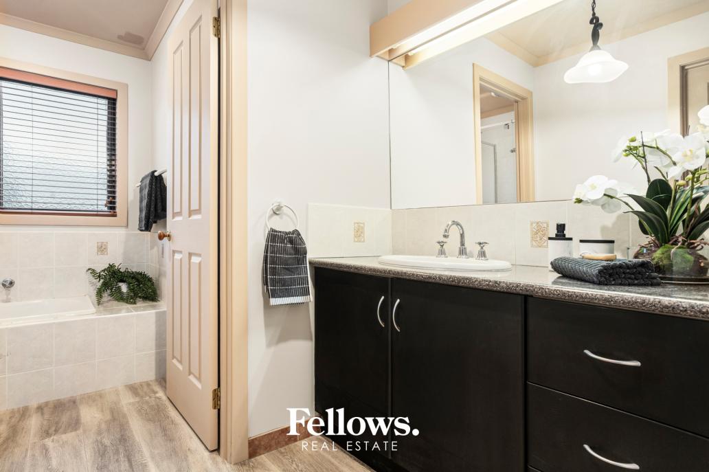 Downstairs, everyday living continues with a spacious laundry/mudroom complete with sink, counters, and a secondary entry, making post-beach rinses, gardening days, and general clean-up a breeze. The bathroom is cleverly designed for privacy and functionality, offering a separate toilet, generous vanity with extended bench space, frosted windows for natural light, and a dedicated bathing zone featuring a built-in tub, glass shower, heat lamps, and serene backyard outlook.