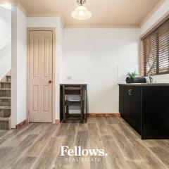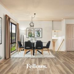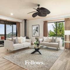 Step inside to a light-filled living room, framed by large windows that draw the outdoors in and create the perfect backdrop for cosy evenings by the crackling coonara fireplace. Direct access to the front porch allows you to host seamlessly and soak in the spectacular bay scenery whenever you please. The adjoining kitchen blends style and practicality with rich custom dark cabinetry, wrap-around stone-look benchtops, stainless-steel appliances including a dishwasher, a four-burner cooktop, pantry, tiled splashback, and a double-basin sink with drainage placed perfectly beneath a window to capture those calming bay views.