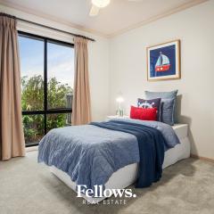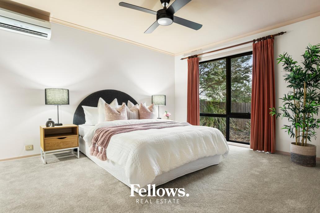 Rest and recharge in the main bedroom with a large window, built-in robe, ceiling fan, and split-system heating and cooling. The second bedroom also includes a built-in robe and enjoys tranquil views of the landscaped garden.