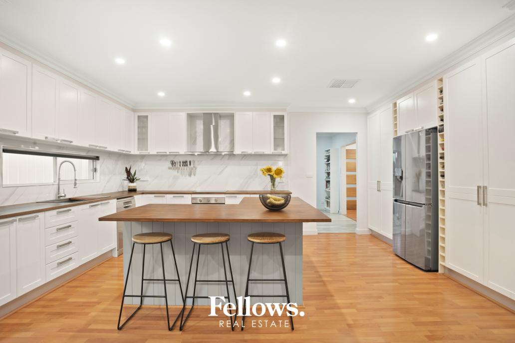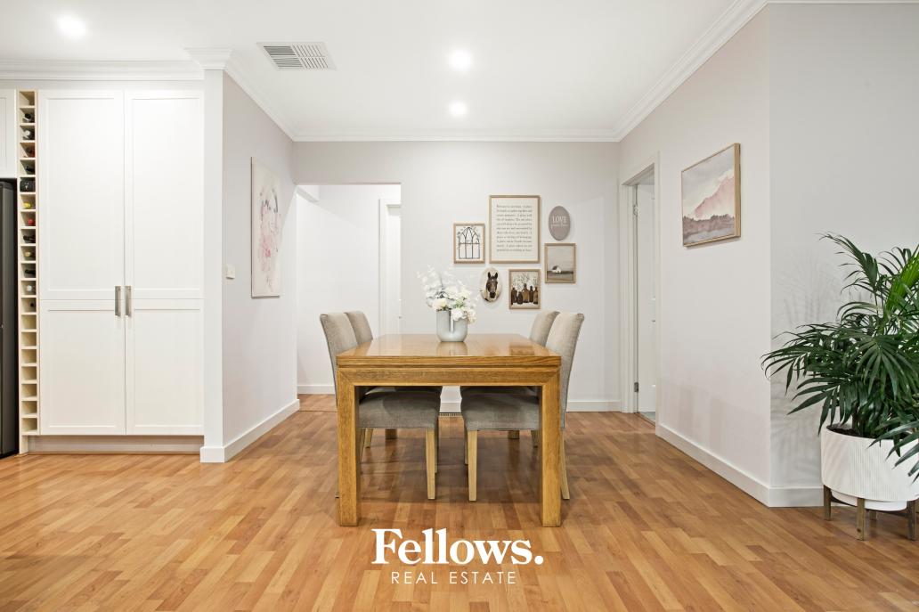 The kitchen is both stylish and highly functional, featuring an L-shaped island with breakfast bar, stainless steel appliances, dishwasher, generous cabinetry, and additional pantry storage surrounding the fridge. The dining area comfortably accommodates a six-seater and flows effortlessly through sliding doors to the outdoors.