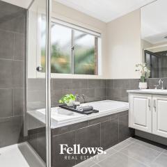 A second living area is cleverly positioned separate from the main hub of the home, making it perfect as a study, secondary lounge, or play space. Bedrooms two, three and four each offer space for a queen bed and double-door built-in robes while the main bathroom showcases beautiful grey tiling, a glass shower, soaking tub, spacious vanity with large mirror, plus a separate toilet for added convenience. Multiple hallway closets provide excellent additional storage.