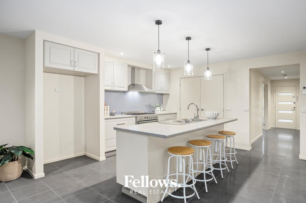 From here, the home opens into an expansive open-plan zone where the kitchen, living and dining areas flow together with ease. Ducted heating, split system heating, and cooling, two ceiling fans and picturesque windows keep the space comfortable and inviting, and the living and dining areas can be interchanged to suit your lifestyle. The kitchen is a true highlight, with 900mm stainless steel oven & stove top, custom cabinetry, gorgeous splashback, rangehood, and a central island with breakfast bar and dual basin sink with drainage. A spacious pantry completes this well-designed hub of the home.