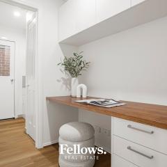 A dedicated study with built-in drawers, overhead cabinetry, and timber benchtop provides the ideal work-from-home setup or study zone, while the well-appointed laundry offers overhead cabinetry and convenient outdoor access to the clothesline.